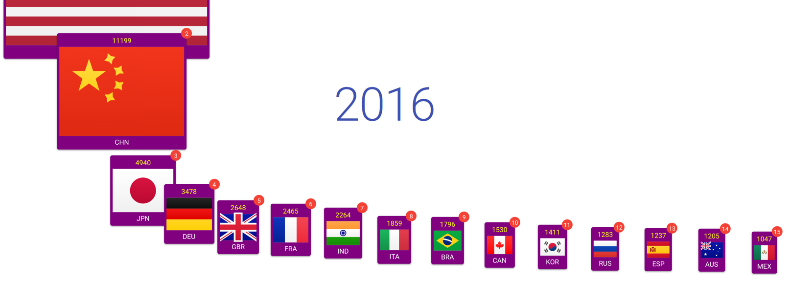 Interactive animated visualization of world GDP rankings from 1960 to present using React